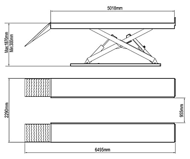 В основе ножничного подъемника Atis X550 лежат два синхронизированных гидроцилиндра. С помощью винтов происходит регулировка фиксирующих пластин, что позволяет легко обеспечить попадание пластин в пазы на определенной высоте подъема. Ножное управление устройством безопасности. Привод располагается с каждой стороны подъемника.
