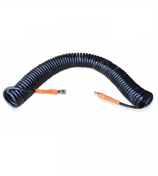 Шланг пневматический WDK-65715. Полиуретановый с фитингами БРС. Витой, длина до 15метров, 8*12мм, рабочее давление 135PSI (10бар). Кратковременное давление до 800PSI. Цвет черный.