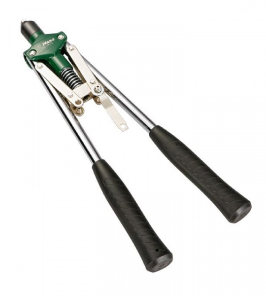 Заклепочник промышленный Hans 1972. Прочный и надежный ручной инструмент, с помощью которого удобно скреплять листовые материалы. Изделие работает совместно с вытяжными заклепками размерами 3.2, 4.0, 4.8, 6.4 мм. Заклепочник рычажного типа снижает усилие при проведении работ. Инструмент обладает двумя удобными рукоятками.